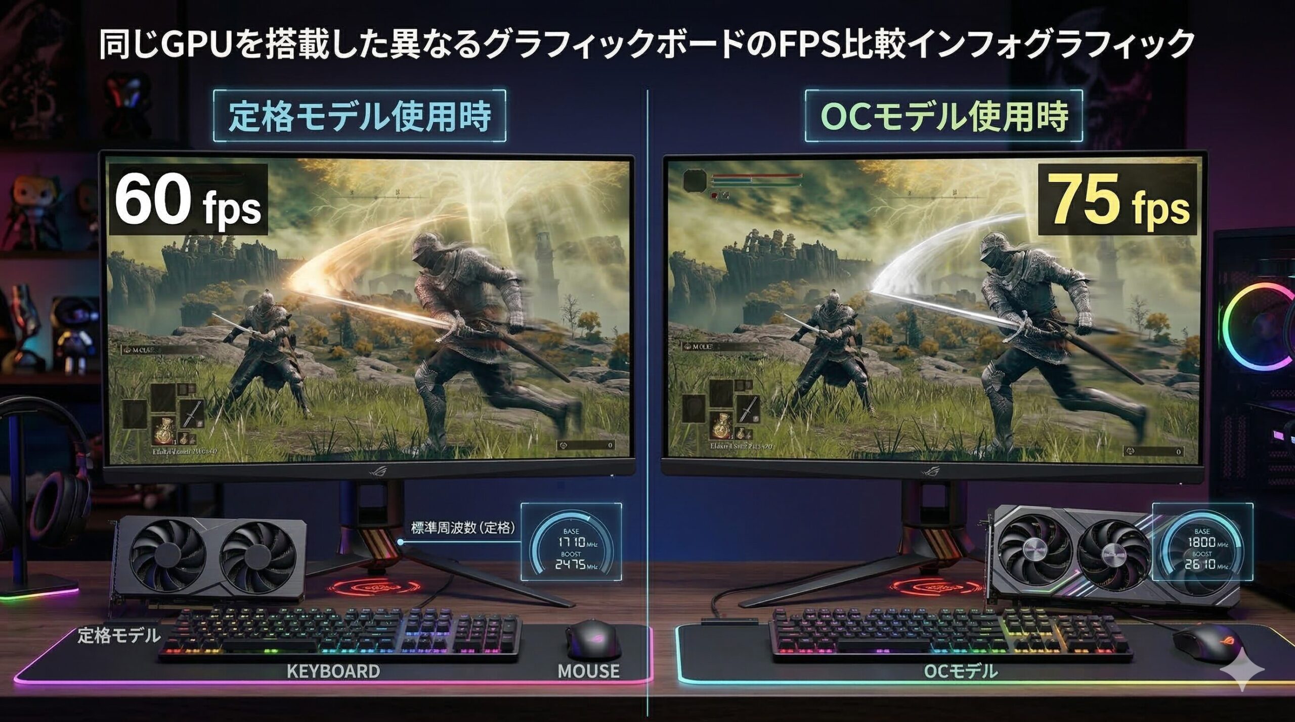 とくに、一瞬の判断が勝敗を分けるFPSゲームや、高解像度(WQHDや4K)で美しいグラフィックを楽しむRPGゲームなどにおいて、数フレームの向上が快適さを大きく左右します。