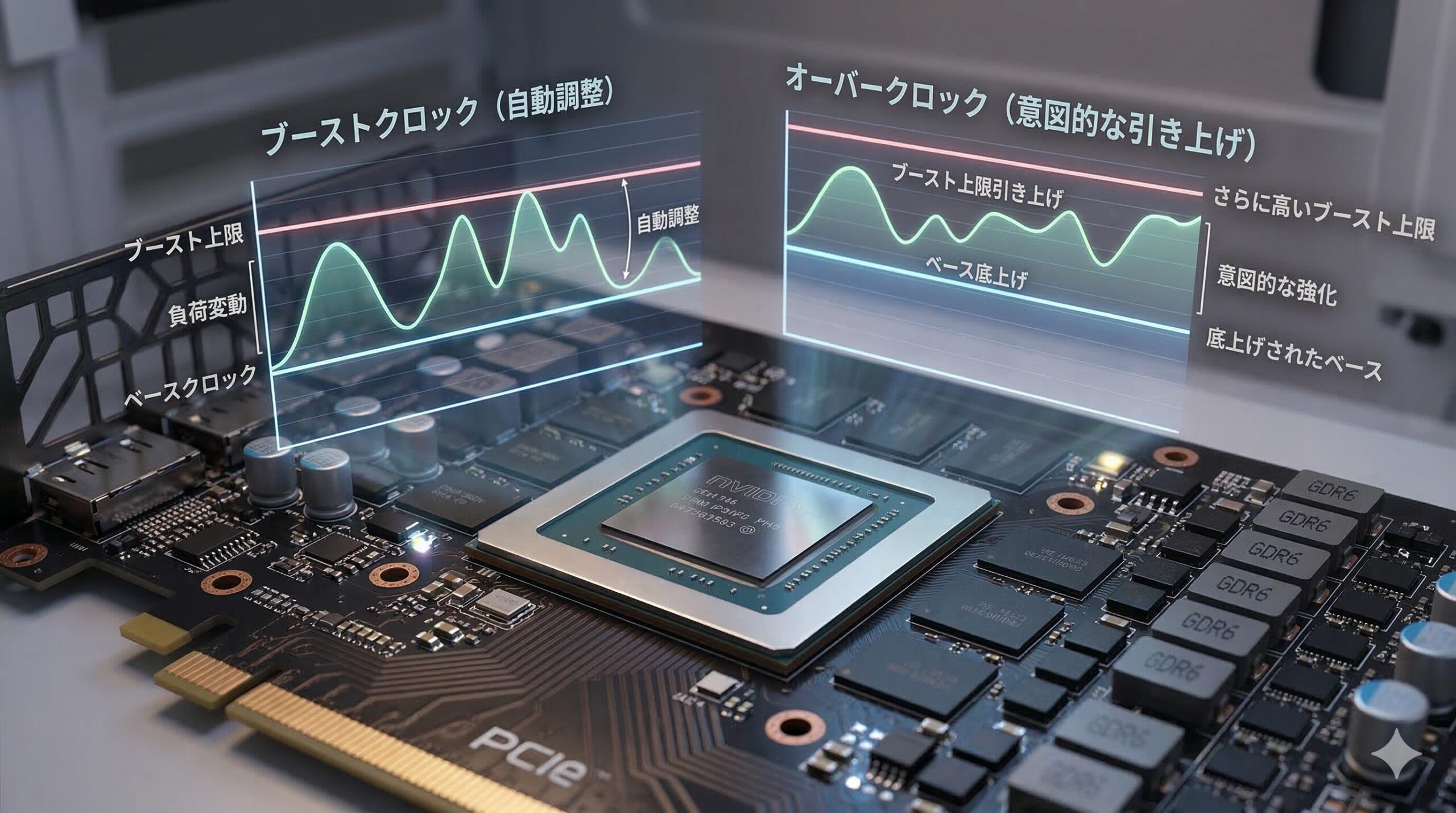 ブーストクロックとオーバークロックの違いですが、ブーストクロックはGPUの温度や電力に余裕がある時に、システムが「自動的」にクロック数を引き上げて一時的に性能を上げる標準機能です。