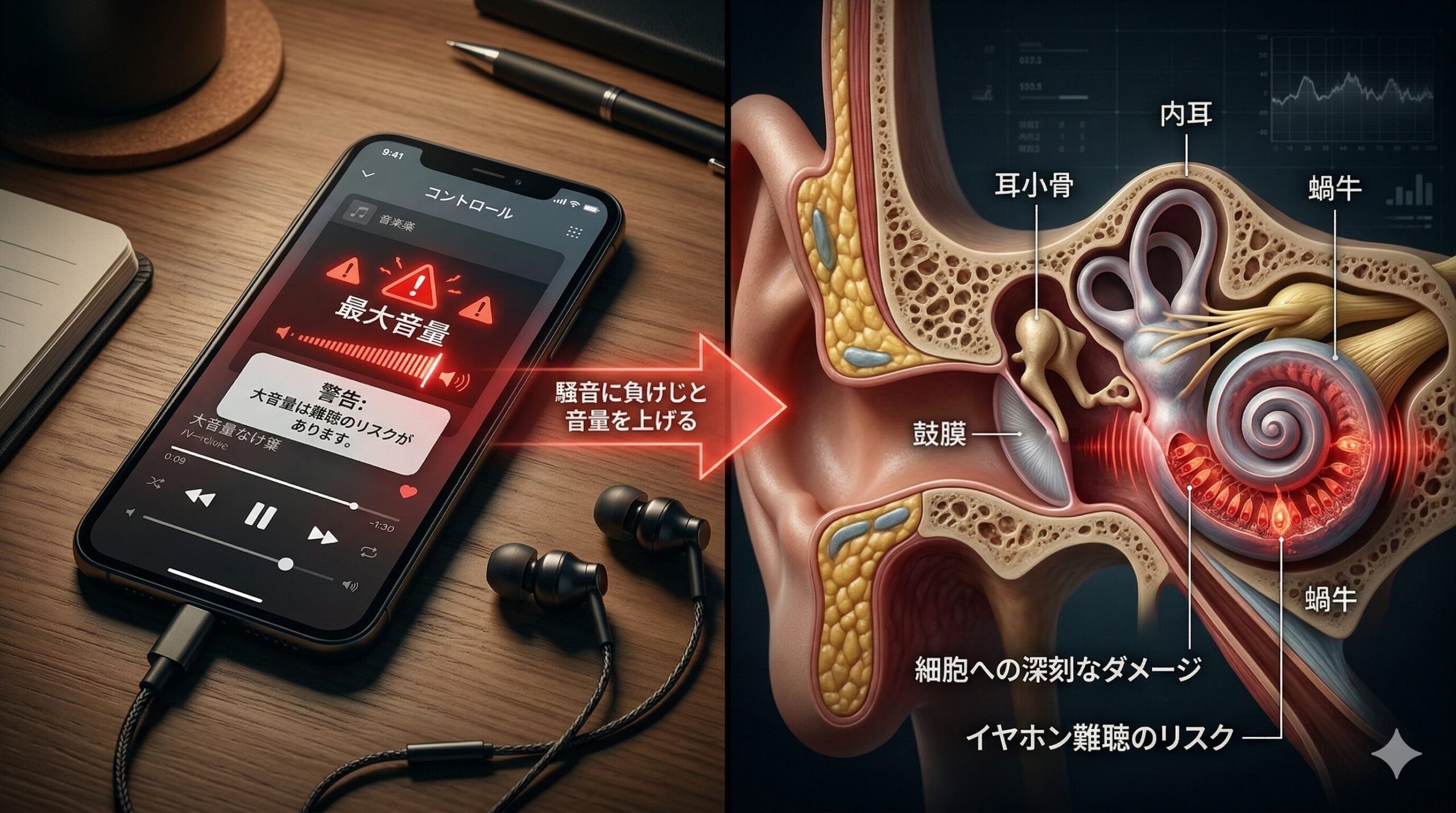 大きな音(85デシベル以上)を長時間聴き続けることで、耳の奥にある有毛細胞が傷つき、「イヤホン難聴(音響外傷)」を引き起こすリスクが高まります。