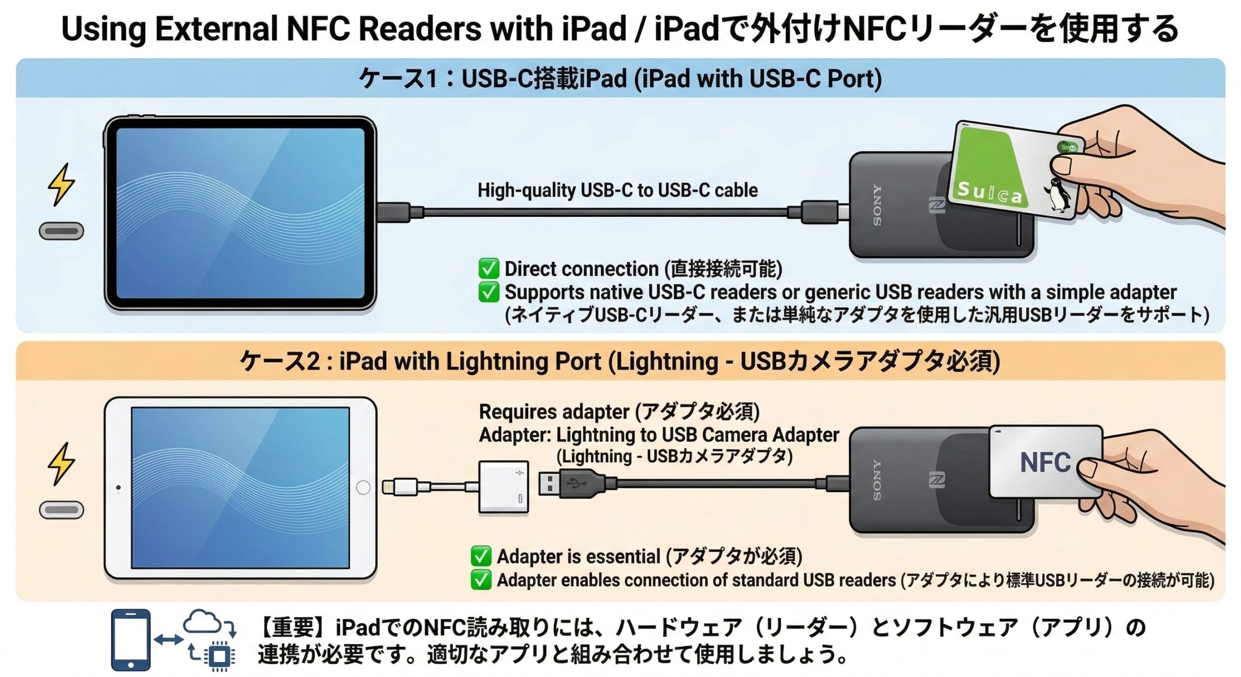しかし、これはあくまで「単体での」話です。iPadはUSBポートやLightningポートを通じて様々な外部機器と接続できる拡張性の高さを持っています。この拡張性を利用すれば、iPadの機能を補い、NFC読み取りを可能にすることができるのです。